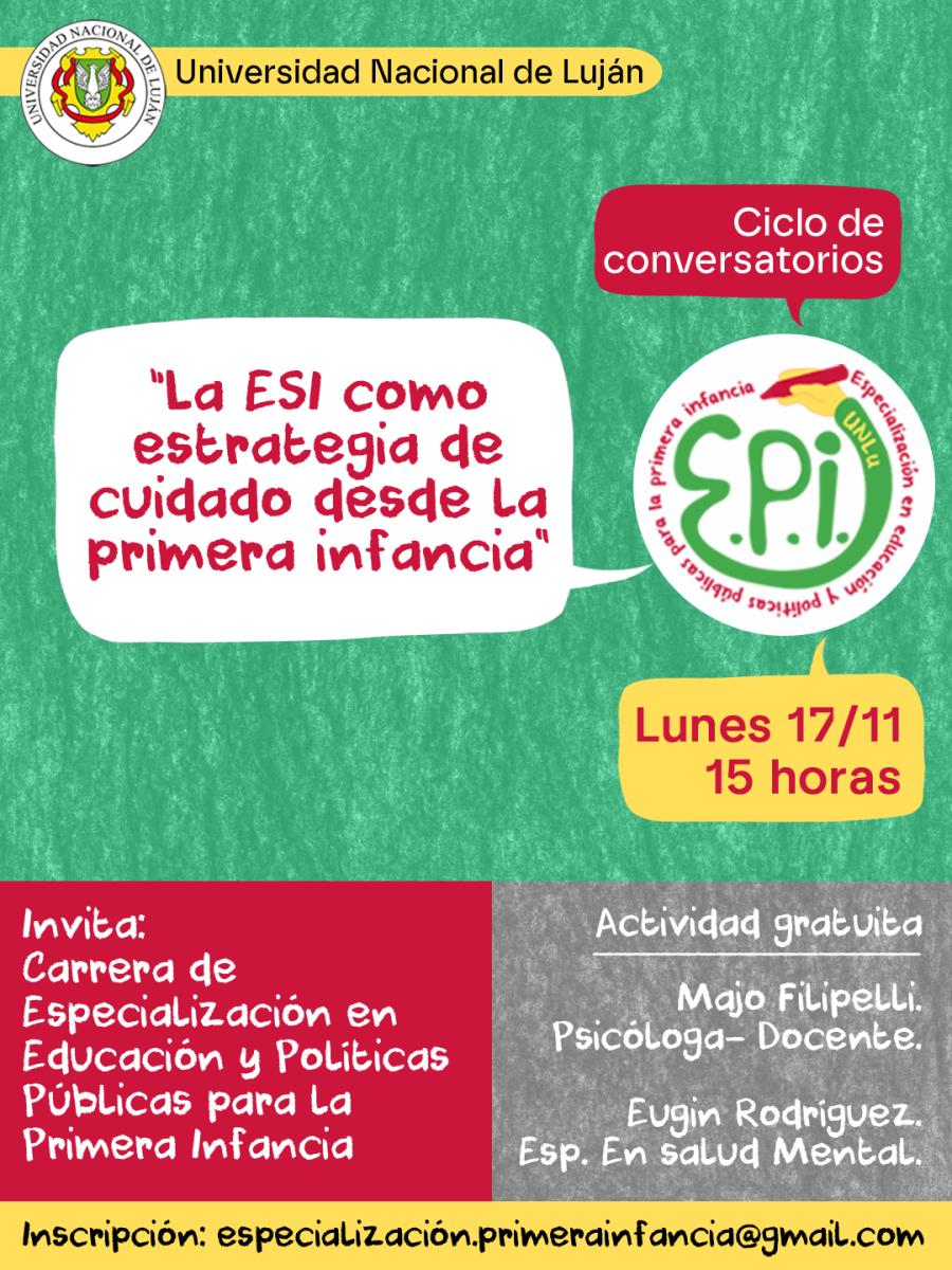 Información del Conversatorio: La Educación Sexual Integral es mucho más que hablar de sexualidad: es una herramienta para cuidar, acompañar y garantizar los derechos con las niñeces. En este conversatorio vamos a reflexionar sobre cómo la ESI puede ser una estrategia en los procesos de cuidados de las niñeces, ya que contribuye a cuestionar estereotipos y a crear espacios donde cada niñe pueda crecer siendo quien es desde el respeto a sí mismo y hacia los demás, valorando la diversidad. Hablaremos sobre los desafíos que aparecen en la educación, la salud, las familias, las comunidades y los vínculos cotidianos, y pensaremos estrategias concretas para acompañar a las niñeces. Un encuentro para repensar nuestras prácticas, abrir preguntas y construir miradas más inclusivas y respetuosas.